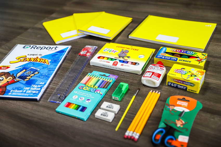 Os estudantes do 1° ao 3° anos vão receber cadernos, papel sulfite (100 folhas), lápis de cor, lápis grafite, borracha, giz de cera, apontador, canetinha hidrográfica, cola, régua, tinta guache, pincel e tesoura.