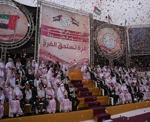 Um momento festivo no centro de Gaza, como uma cerimónia de casamento em massa patrocinada por caridade para 300 noivas e noivos, foi realizada perto do Hospital Al-Aqsa, em Deir el-Balah, com a presença de recém-casados, suas famílias e a comunidade local.