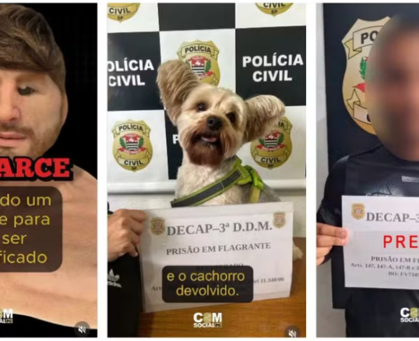 As imagens mostram o momento em que o suspeito entra no local usando uma máscara de silicone, que imita o rosto de outra pessoa, e leva o animal sem levantar suspeitas. A Polícia Civil divulgou os registros, além de fotos da prisão e do objeto utilizado no disfarce.