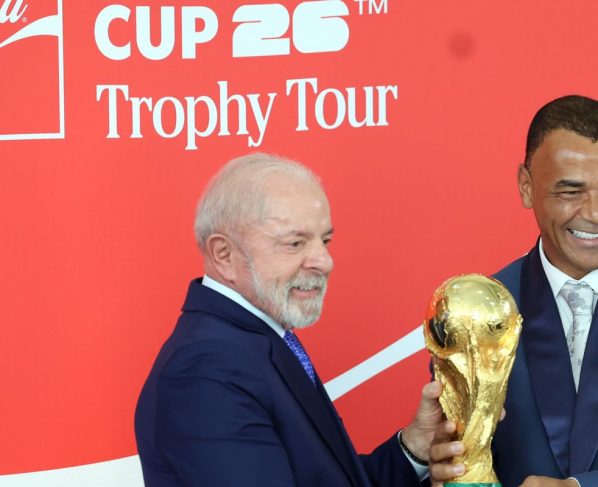 O presidente Luiz Inácio Lula participou, nesta quinta-feira (26), da cerimônia oficial Tour da Taça da Copa do Mundo da Fifa 2026, no Palácio do Planalto. Ex-jogadores de futebol, como Cafu, Jairzinho, Branco, Edmílson, Pepe e a ex-atleta Formiga, da Seleção Feminina, também estiveram presentes no evento, além de ministros e outras autoridades.