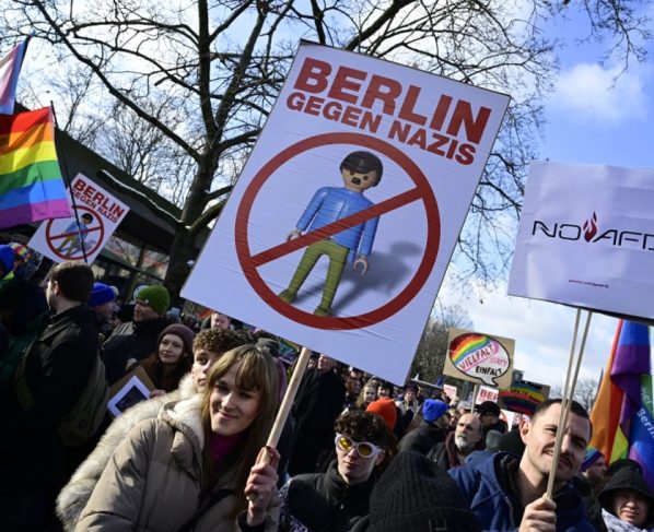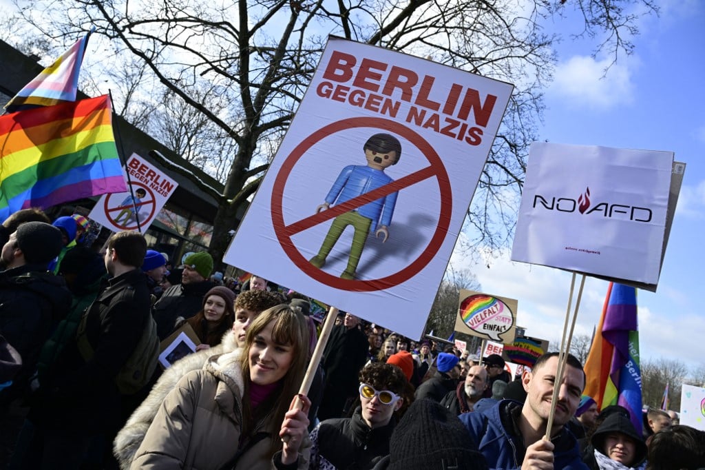 Em Berlim, muitos manifestantes se preocupam ao ver o partido AfD transformado no segundo da Alemanha após as eleições legislativas de 23 de fevereiro, quando as últimas pesquisas estimam que obteria entre 20% e 21% dos votos, atrás do partido conservador, que obteria entre 30% e 32%.