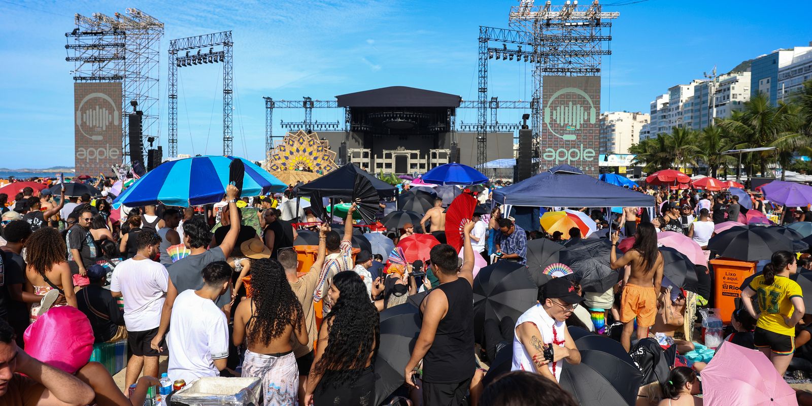 O evento, realizado em espaço aberto, deve reunir público de cerca de 1,6 milhão de pessoas. Segundo relatos publicados hoje (3) em redes sociais, a área reservada da praia foi invadida durante a manhã e a estrutura teria cedido.