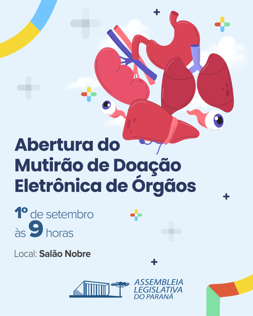 A Assembleia Legislativa do Paraná sediará, ao longo do mês de setembro, um mutirão de doação eletrônica de órgãos. A iniciativa é fruto de uma parceria entre a Comissão Executiva da Alep com o Colégio Notarial do Brasil – Seção Paraná (CNB/PR) e a Associação dos Notários e Registradores do Paraná (Anoreg). Uma cerimônia marcada para as 9h de segunda-feira (1º), no Salão Nobre, abrirá os trabalhos.