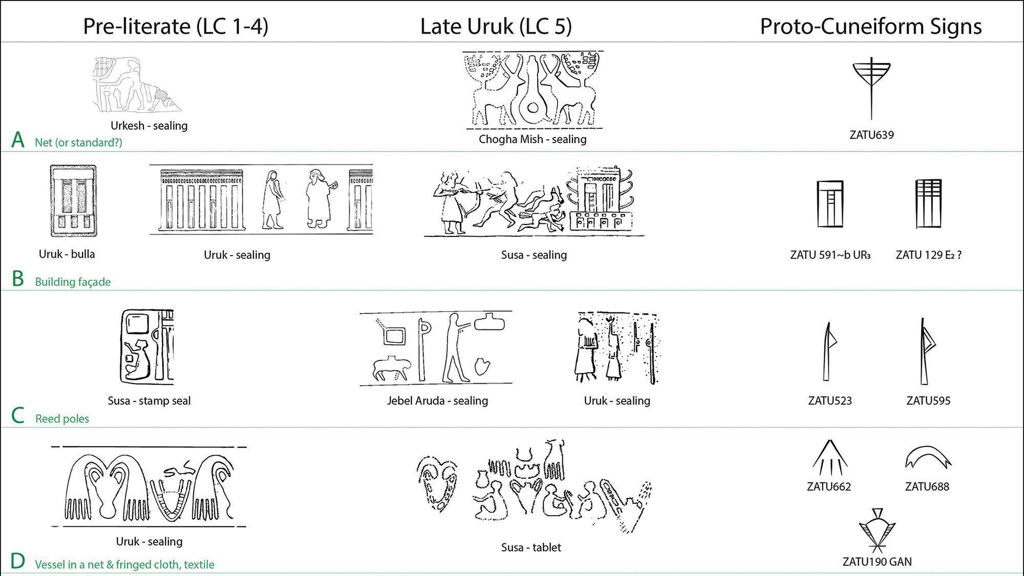 Os pesquisadores há muito pensam que o protocuneiforme se desenvolveu a partir desses métodos contábeis iniciais, mas não havia uma ligação definitiva para mostrar como a transição ocorreu. E, ao contrário dos selos cilíndricos, as centenas de sinais iconográficos atribuídos ao protocuneiforme só foram encontrados em tabletes no sul do Iraque.