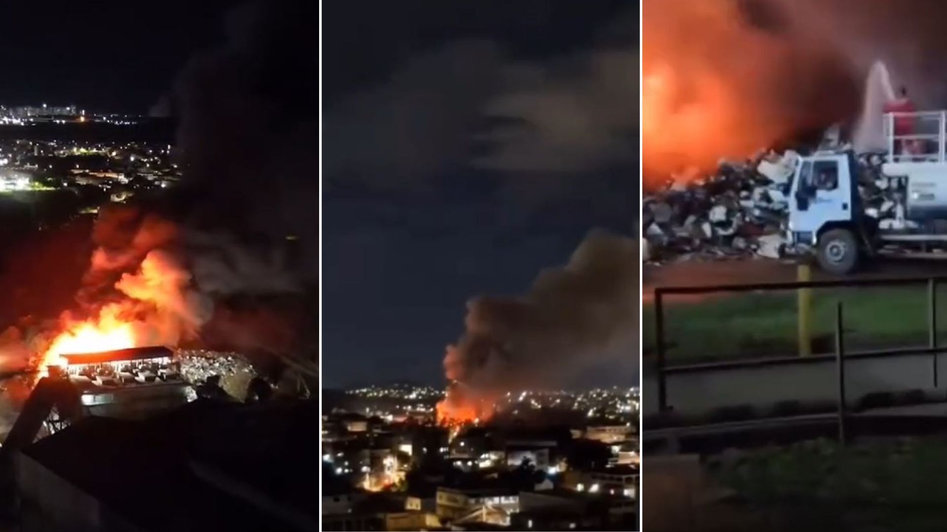 As chamas atingiram a área de sucata no pátio da empresa Grupo Simec. Imagens que circulam nas redes sociais mostram o momento do incêndio e a ação dos bombeiros: