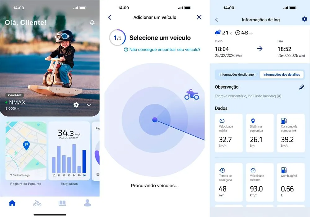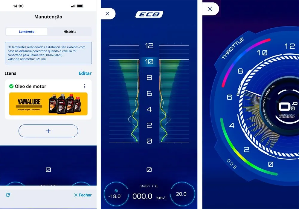 O Yamaha Motor On apresenta uma interface totalmente redesenhada, com navegação mais intuitiva e melhor organização das informações. O processo de pareamento com o smartphone foi simplificado, garantindo maior estabilidade de conexão e uma gestão de dados mais eficiente.